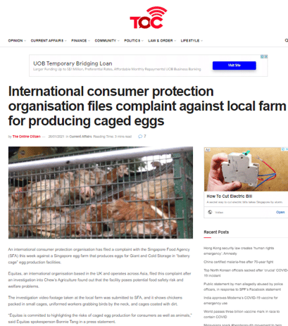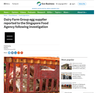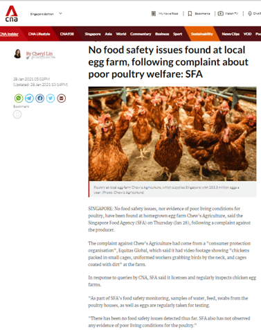Though Channel News Asia wrote this as their headline: “No food safety issues found at local egg farm, following complaint about poor poultry welfare: SFA,” we were able to raise awareness that there could have been — and that there were — indeed food safety issues. Another piece of coverage came out, and it said: “Dairy Farm Group egg supplier reported to the Singapore Food Agency following investigation.”