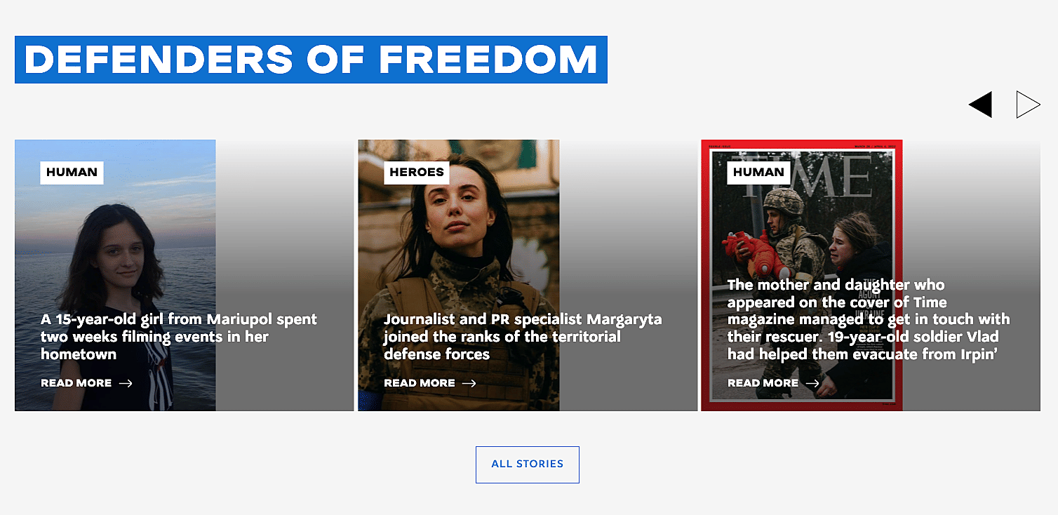 Below that is “Defenders of Freedom” where they got three columns of human heroes — a 15-year-old girl from Mariupol who spent two weeks filming events in her hometown; a journalist and PR specialist named Margaryta who joined the ranks of the territorial defense forces; and a Time magazine cover featuring a mother and daughter who managed to get in touch with their rescuer.