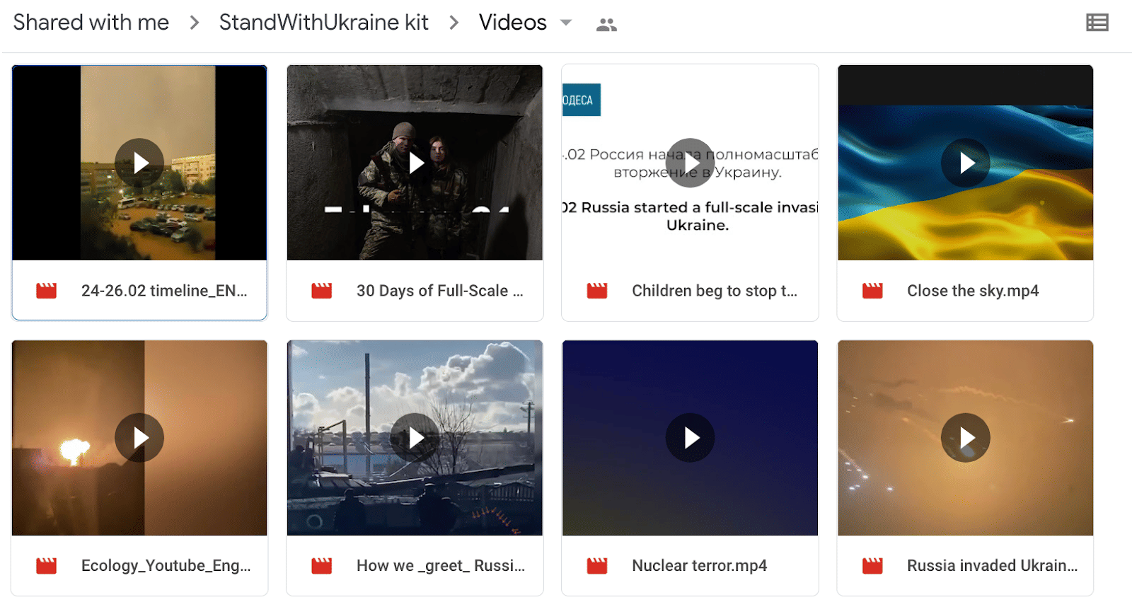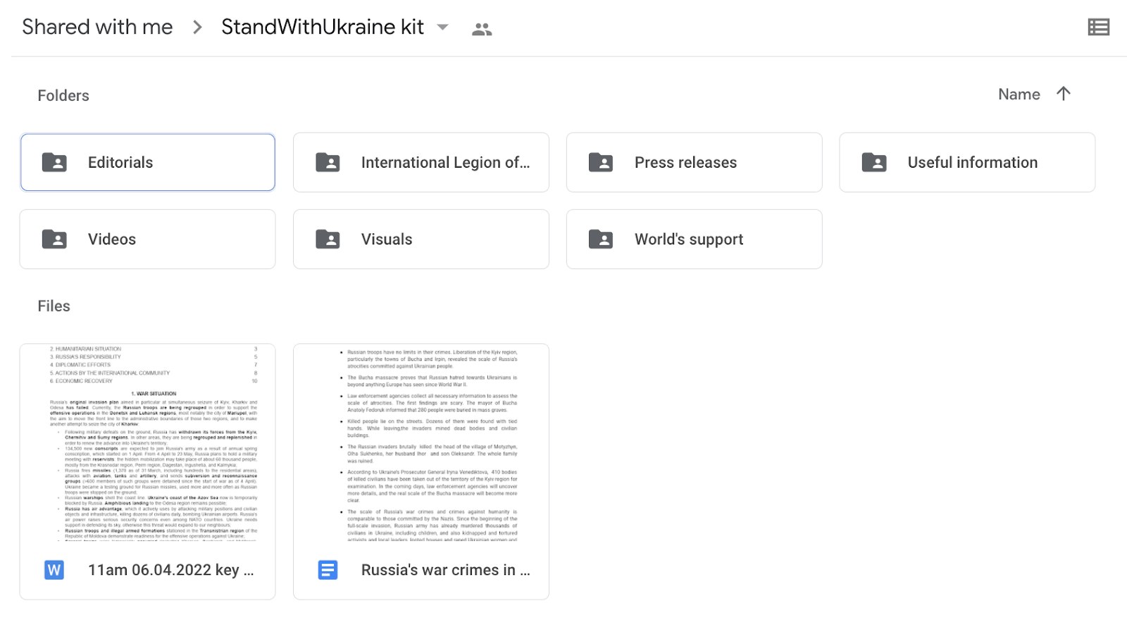 And what I’m also interested about, from a PR point of view, is that if you go to the part where it says you can use their media kit, the button goes straight to a Google Drive. In there, they’ve got different folders — World’s support, Visuals, Videos, Useful information, Press releases, International Legion of Defense, and Editorials.