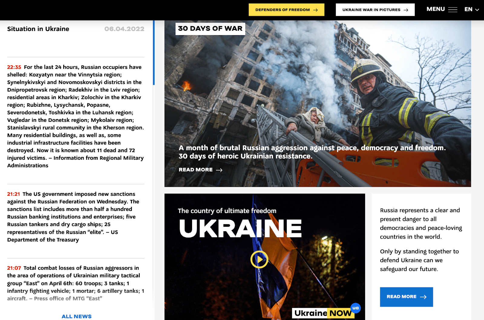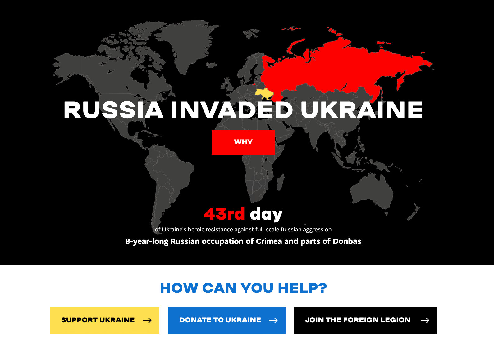 On the website that the MFA created, it says, “Russia Invaded Ukraine. Why.” It has a map of Russia all in red and then it has Ukraine in yellow. Ukraine obviously looks not even 1/20th of the size of Russia. At the time of writing, it’s the 43rd day of the attack, as stated on the website. It’s a very simple yet effective graphic.