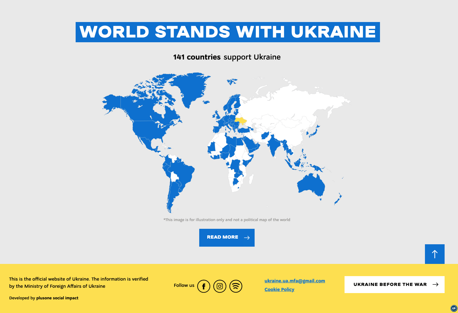 Below that, it says, “141 countries support Ukraine.”  There’s a map of the world depicting the countries supporting Ukraine in blue, Ukraine in yellow, and Russia and the rest in white.