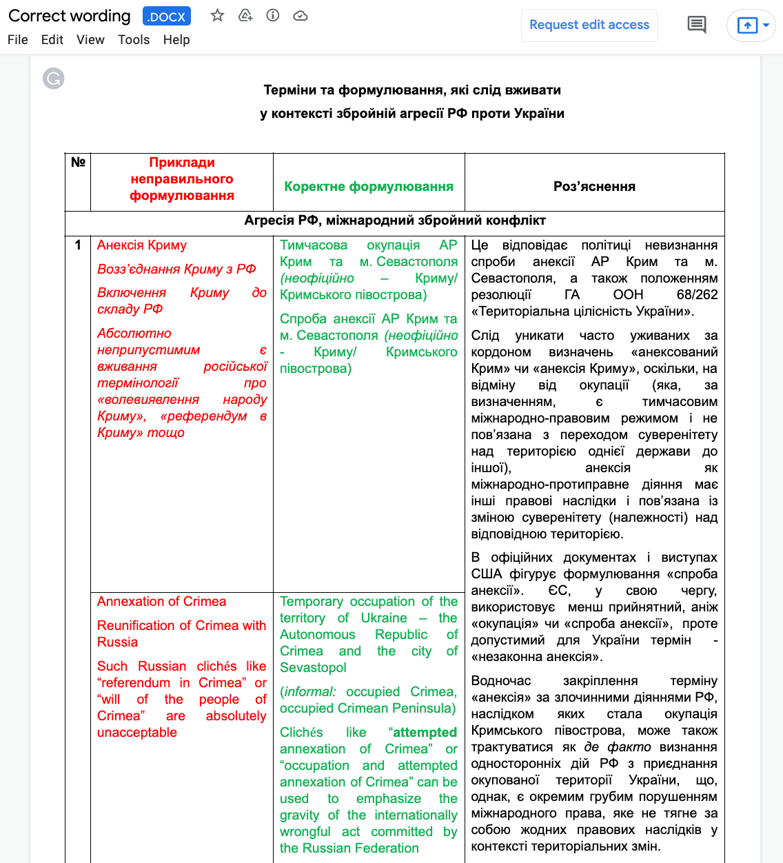 The document explains wordings such as “Annexation of Crimea,” “Reunification of Crimea with Russia.” It also states that “such Russian clichés like ‘referendum in Crimea’ or ‘will of the people of Crimea’ are absolutely unacceptable.”