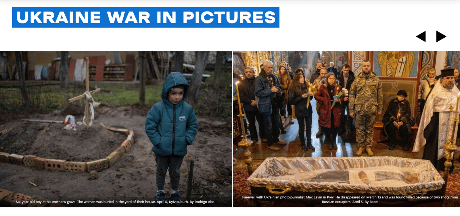 The website also has a section called “Ukraine War in Pictures.” It features a photo of a six-year-old boy at his mother’s grave. It’s pretty heartbreaking. There’s also a photo captioned “Farewell with Ukrainian photojournalist Max Levin in Kyiv. He disappeared on March 13 and was found killed because of two shots from Russian occupiers.”