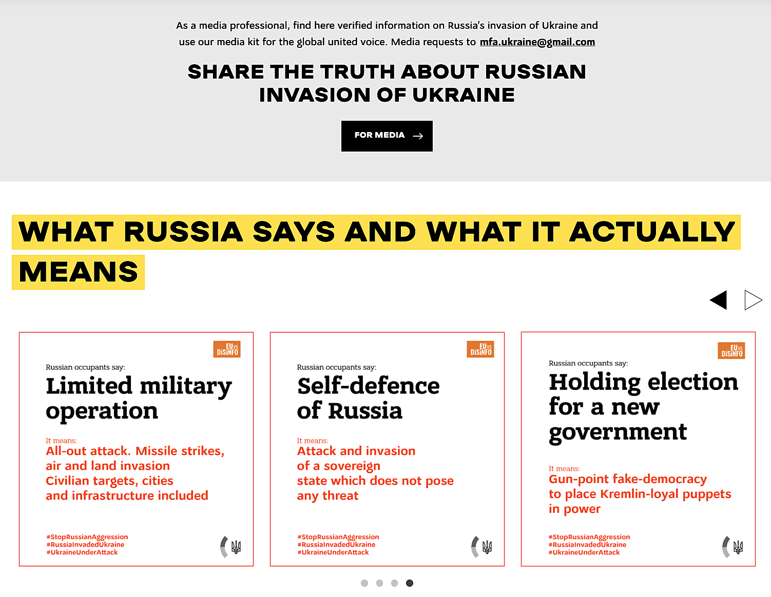 Halfway down the website, there’s a section for the media. It says: “As a media professional, find here verified information on Russia’s invasion of Ukraine and use our media kit for the global united voice. Media requests to mfa.ukraine@gmail.com.” There’s also a statement that goes “Share the truth about Russian invasion of Ukraine.”