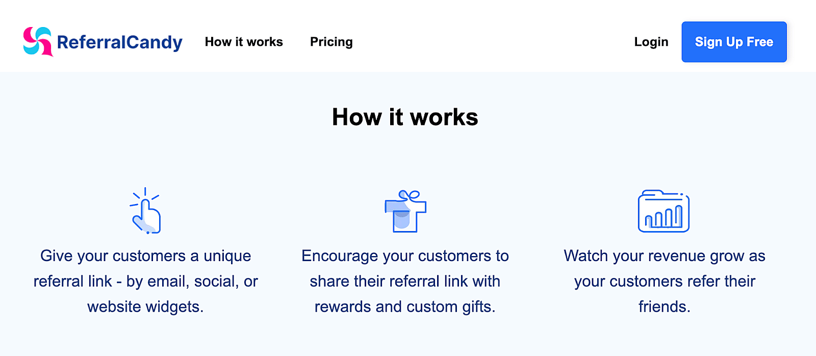 ReferralCandy works by integrating it with your e-commerce store. Basically, they give each of your customers a unique referral link that they can share with their friends. Once they share it — whether through social media or text messaging — their friends who will click on the link will be taken to a landing page with the offered description. For instance, it could be a 20% off coupon code on your shop. When they complete a purchase with the code, ReferralCandy will track the whole referral activity and reward the customer who made the recommendation in the first place.