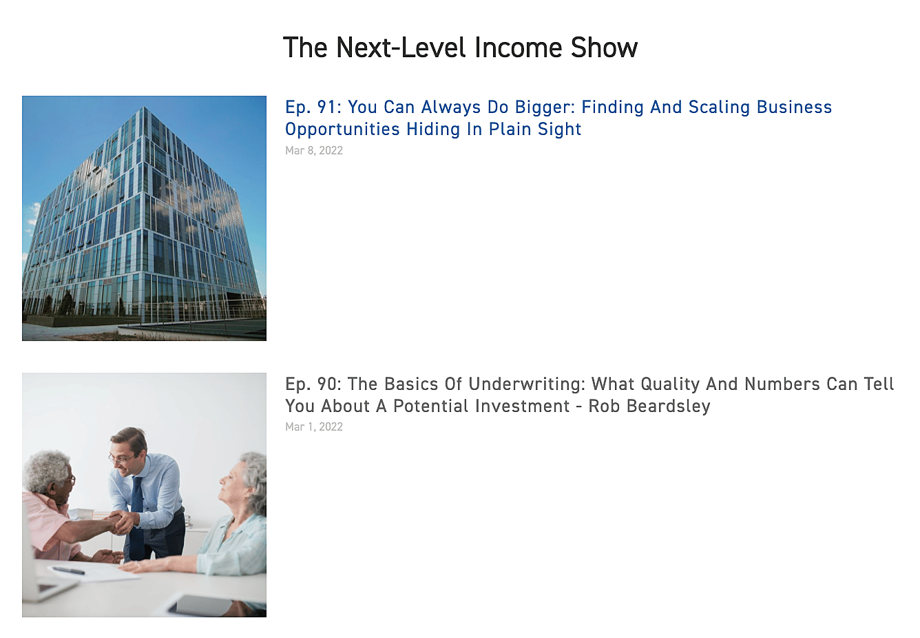 The Next-Level Income strategy is how to make more money, keep more money, and, ultimately, grow your money. He talks about these three subjects on the podcast. These are rather pretty broad but they can help business owners and professionals increase their earning capacity — people who are at a certain part of their career.