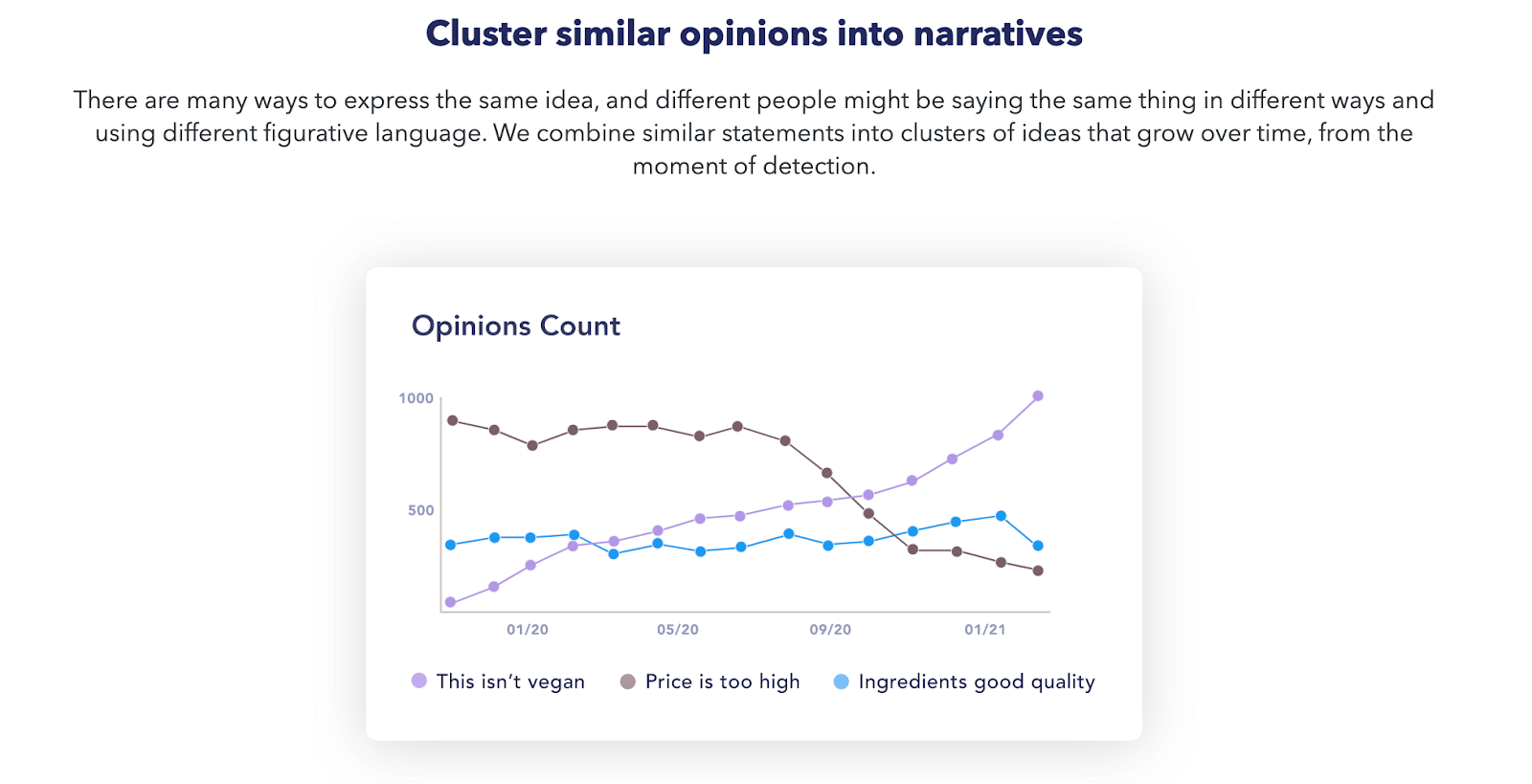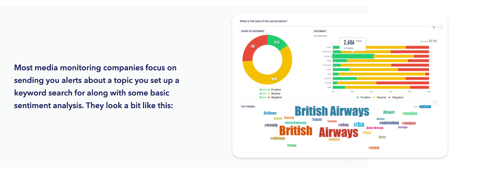 In terms of gathering data, they do the exact same thing as what other players do. They go out and find out all those mentions about you — including tweets, Facebook posts, articles. Then, it will produce a word cloud. However, as this doesn’t really state reasoning, they then run it through their topic clustering technology and get narratives out of it. They’re able to find common threads and narratives across different mentions and platforms. They use automation to identify these and provide you with data that you can look at and interact with.