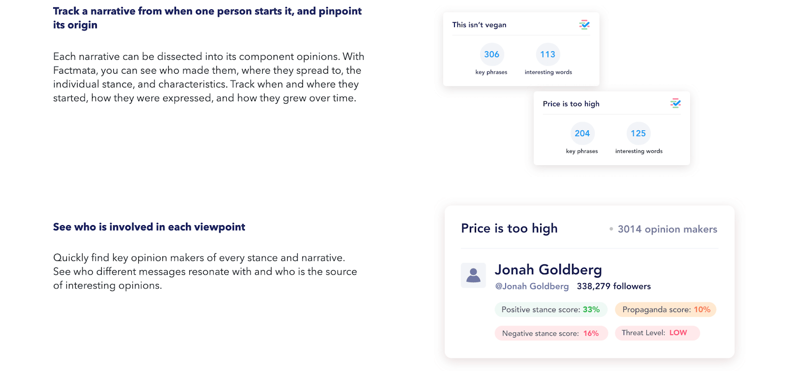 Factmata can tell you both the narratives and the people that influenced these narratives. However, it all comes down to what really matters to you. If you’re interested in avoiding risks and crises, you can use their narrative identification service and look for the riskiest, most threatening, and most toxic content out there and base your strategies on that.