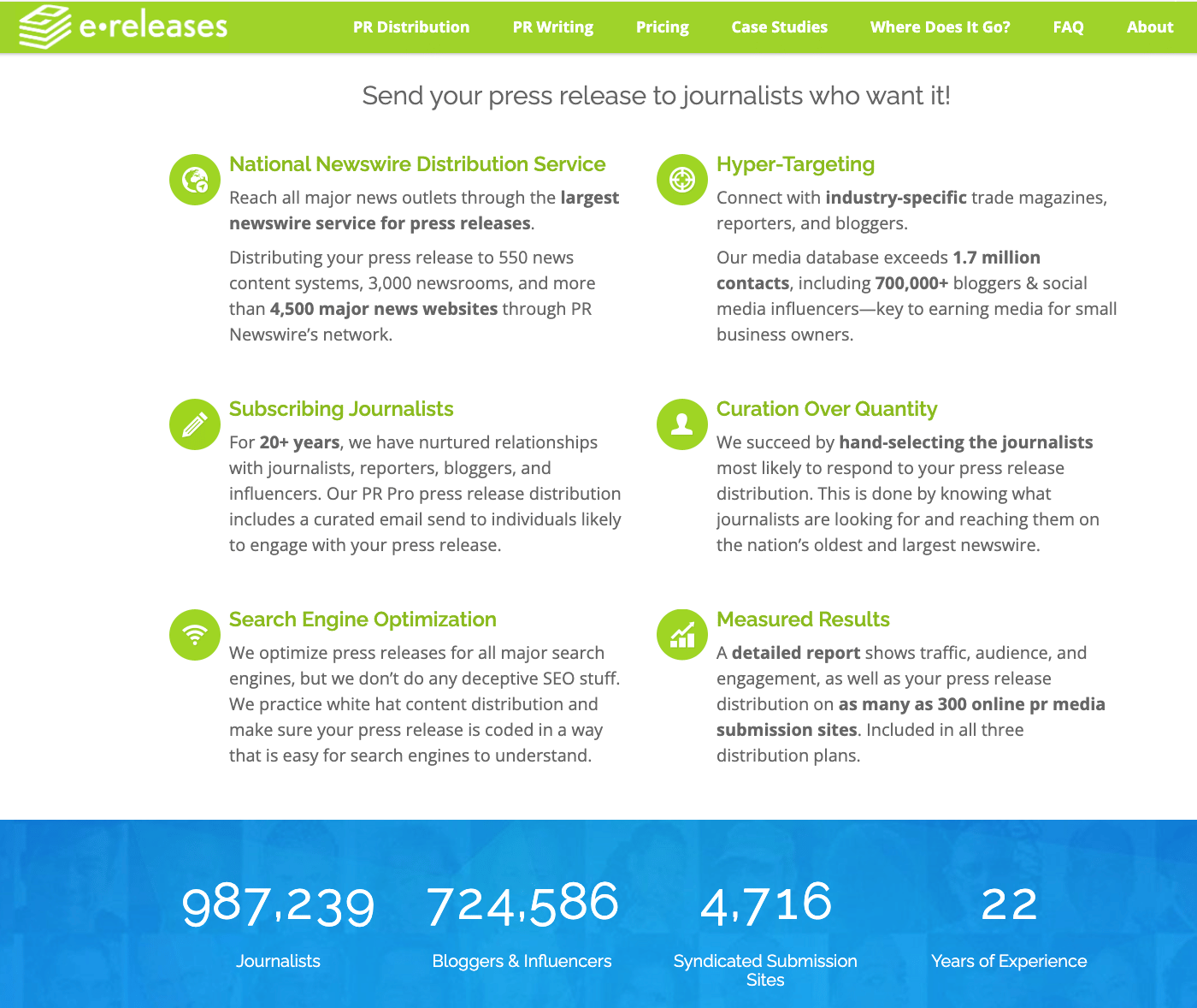 eReleases offers custom national distribution over PR Newswire. They also provide a higher-end product wherein they send emails to journalists that they feel would be appropriate for their clients’ press releases. The number of recipients varies from 100 to 400.