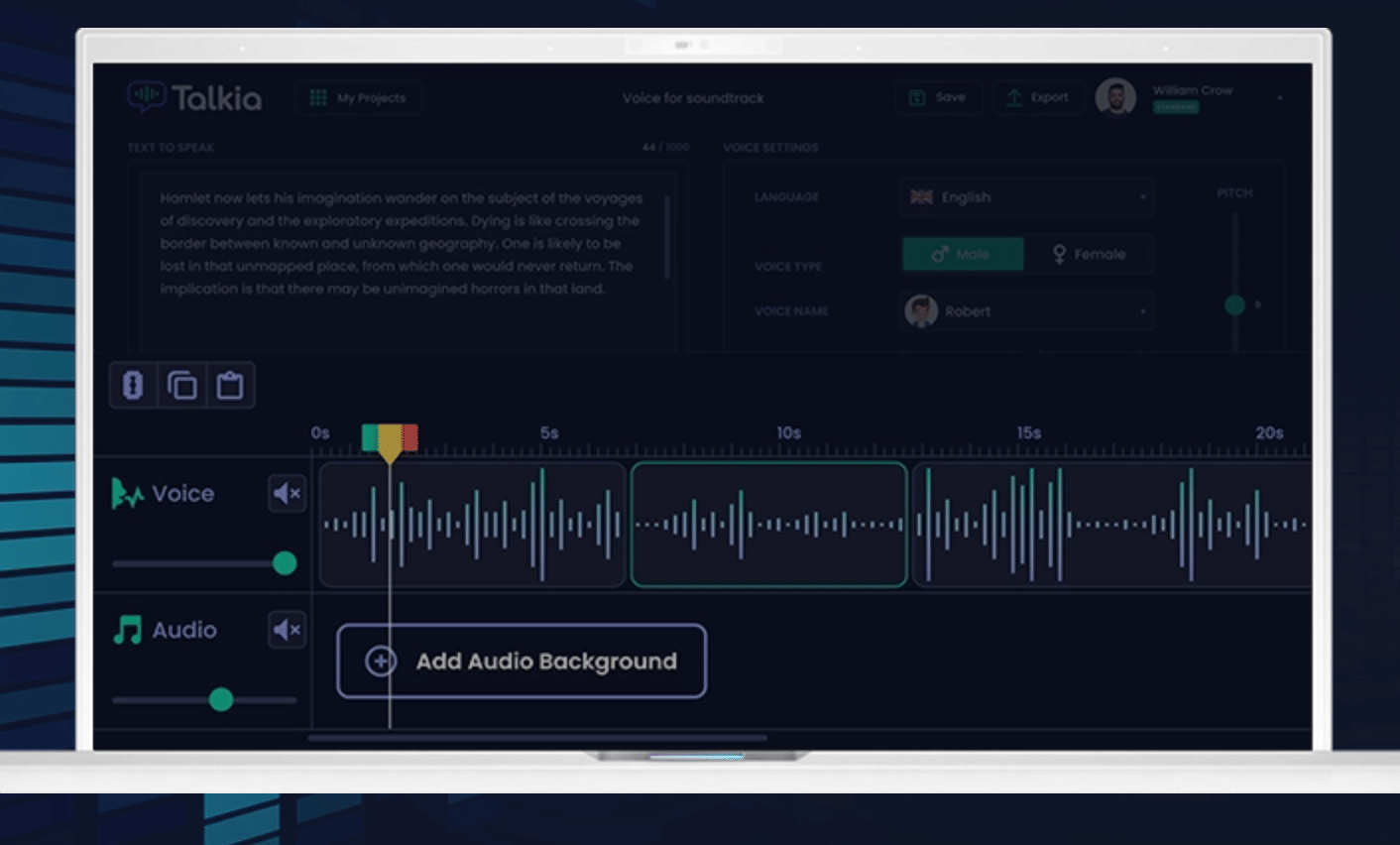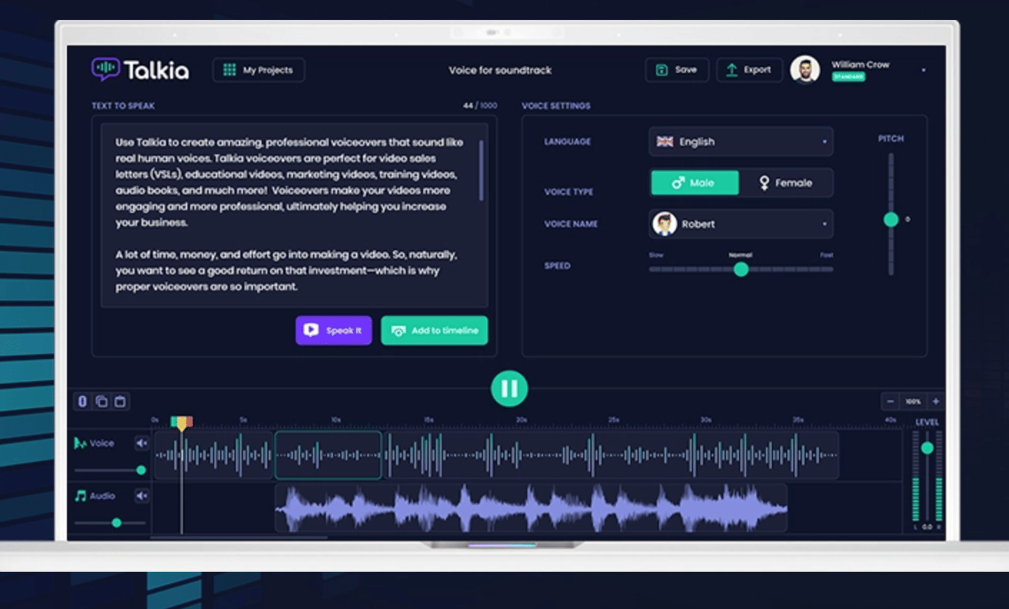 With Talkia, you can add in pauses, change the accent, increase the grade of the accents, add background music, and increase or reduce the volume of the voice.