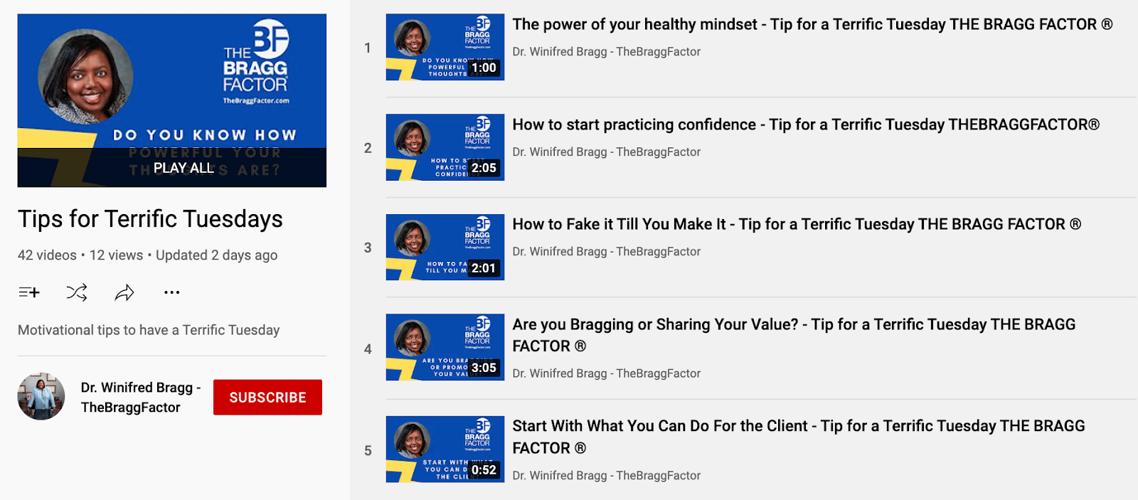 She has a website called TheBraggFactor.com. She also has a YouTube channel of the same name. Every Tuesday, she provides entrepreneurs with tips through “Tips for Terrific Tuesdays.” Most of us start off the week with all these problems and she felt that come Tuesday, it’d be essential to hear a tip that will help us stay focused and confident so we can move forward.