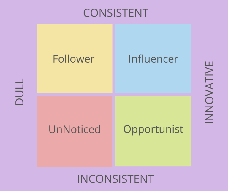 If you’re sending out dull information inconsistently, you’re what I call unnoticed. If you’re sending out dull information consistently, you’re a follower. If you’re sending out innovative information inconsistently, you’re an opportunist; if you’re sending out consistently innovative information, you’re an influencer.