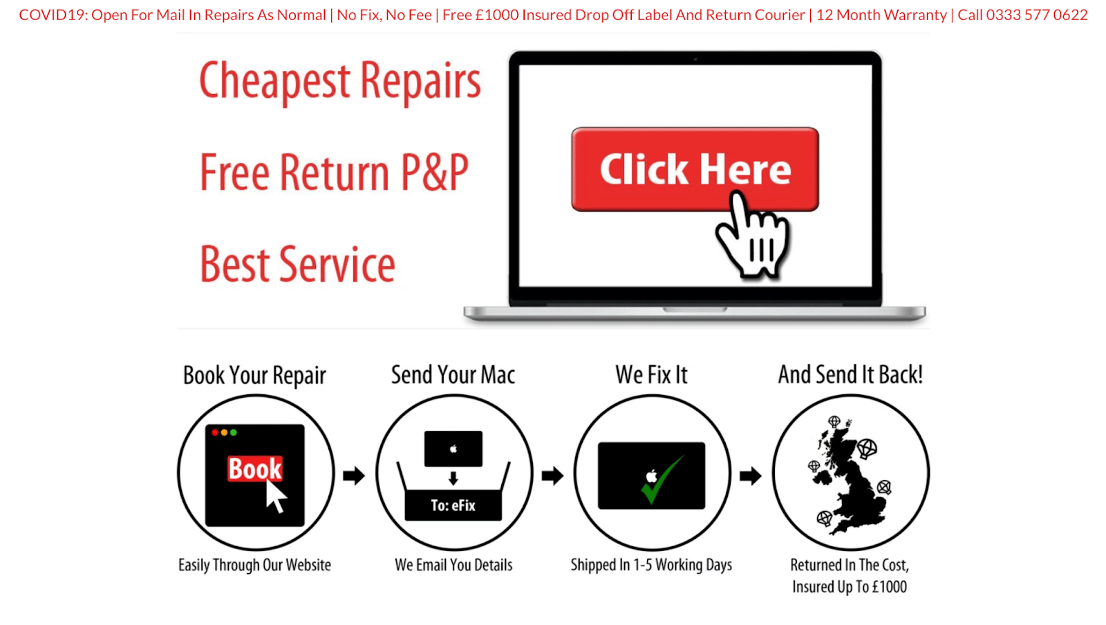 When I went online to look for someone to fix the broken Mac, I was a bit nervous. Because when you go online, you never know whether you’re going to get what you’re looking for. We went first to the Apple shop and they quoted me £900, which is actually more than the replacement costs. So our alternative was to look online and www.MacBook-repairs.co.uk (run by a company called eFix Ltd) came up, which was both an ad and a top-of-the-search rankings website. They have a very simple, straightforward, and easy-to-read call-to-action: Open for mail-in repairs as normal; No fix, no fee; Free £1,000 insured drop-off label and return courier; 12-month warranty; and a phone number. What I also noticed is that they have over 900 positive reviews across Google. So they’re a company that is really focusing on reassuring me on the first part of my customer journey, which is researching.