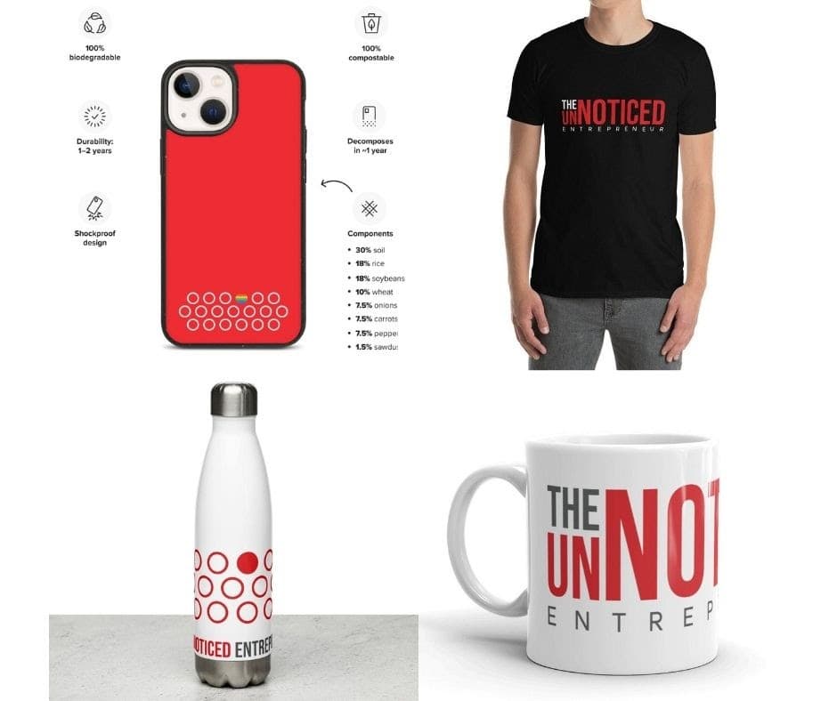 We’ve made the designs of the logos, uploaded those to Printful, and applied them to a number of products that are available on the platform. The platform has got everything — from clothing to ceramics. I’ve chosen my UnNoticed Entrepreneur dots to be applied to hats, t-shirts, tote bags, cooking aprons, water bottles, mugs, and phone cases. All of the products appear to be really good quality.