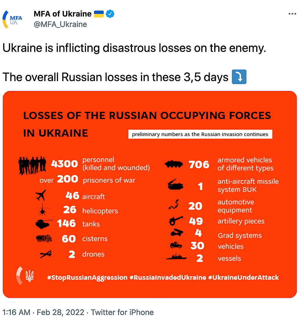 It shows some preliminary numbers as the Russian invasion continues. It has icons to show 4,300 personnel were killed, 200 were prisoners of war, there were 46 aircraft, 26 helicopters, 146 tanks, 60 cisterns (which are mobile tanks), and two drones. It also has the hashtags, #RussiaInvadedUkraine, #UkraineUnderAttack, and #StopRussianAggression. They also did the same infographic on the same day but in Russian. It shows how they’re using social media very cleverly.