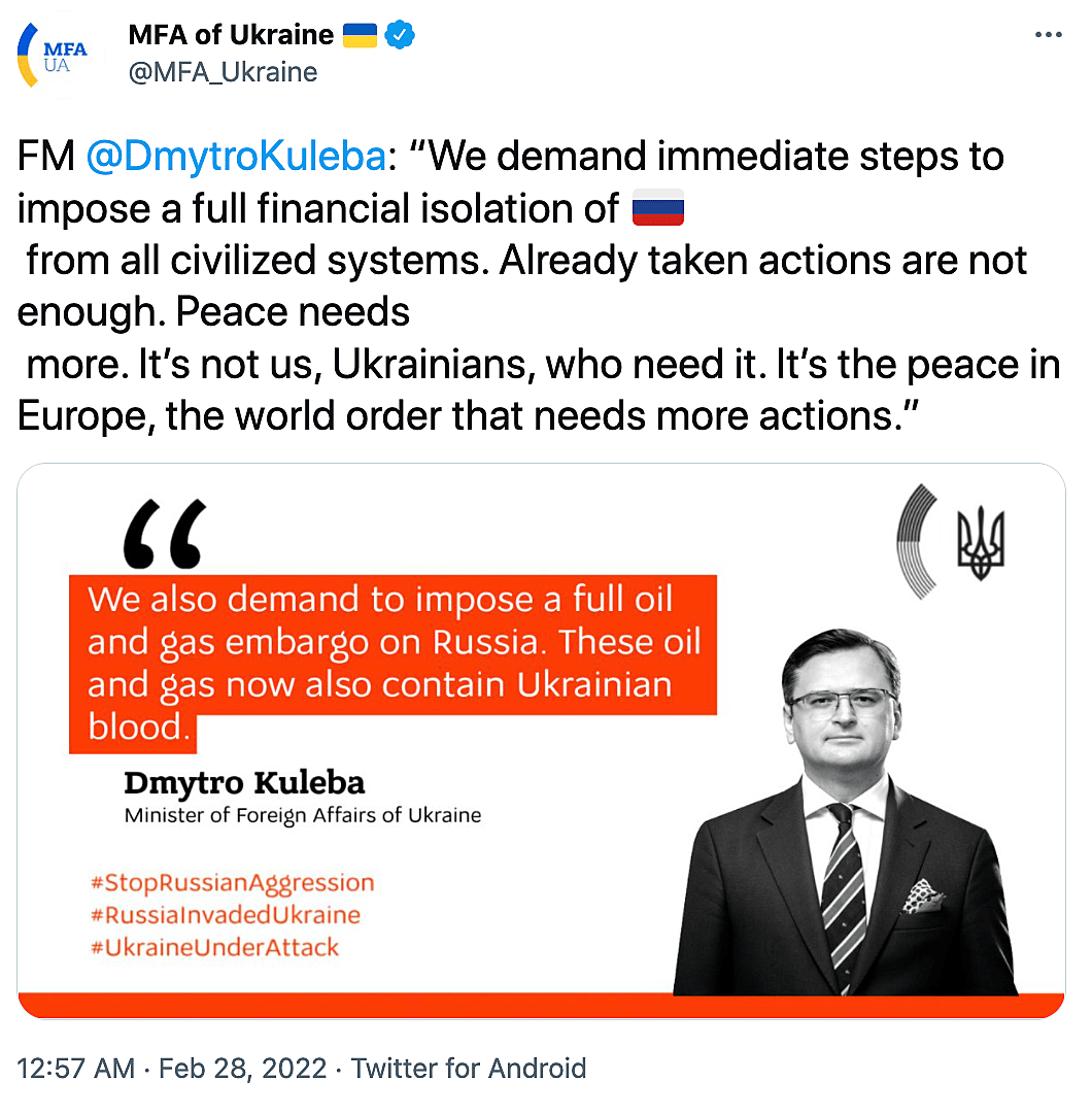 They also did a very delicately done infographic of Dmytro Kuleba, the Minister of Foreign Affairs of Ukraine, where it says that they “also demand to impose a full oil and gas embargo on Russia. These oil and gas now also contain Ukrainian blood.”