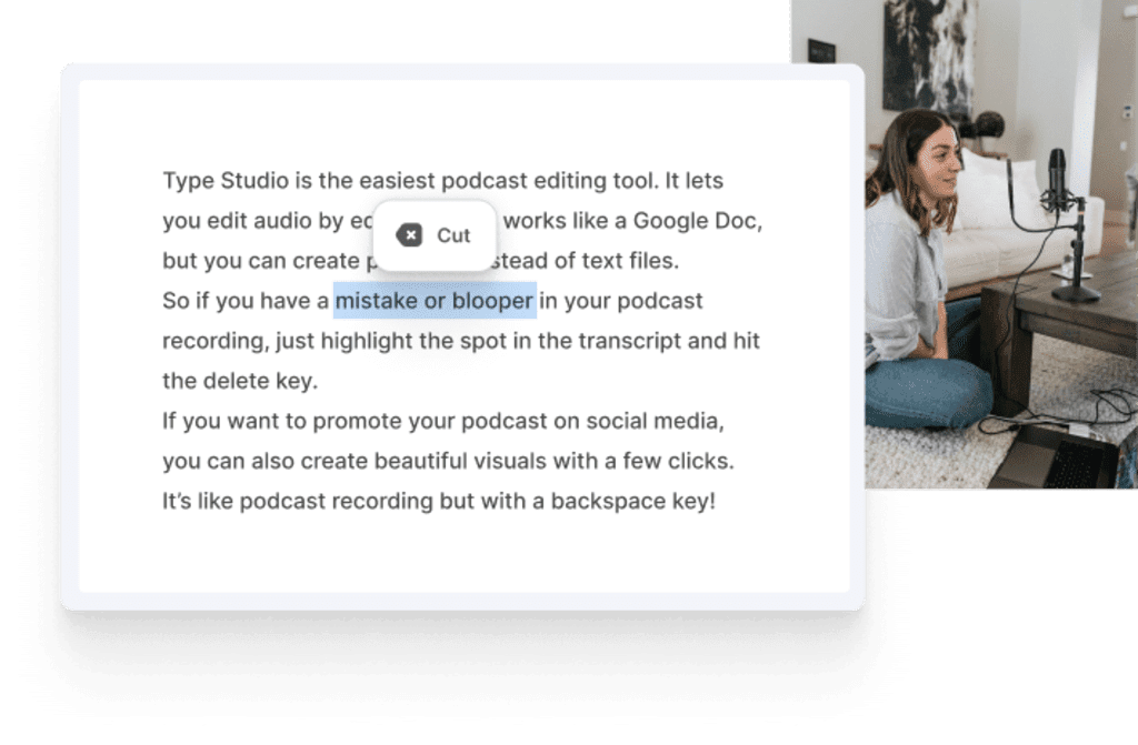 If you have bloopers and mistakes in your recordings, you can simply highlight the text and click on the delete button. The deleted words in the text will be automatically removed from your audio or video file. You can also add subtitles or translate your transcript into different languages.