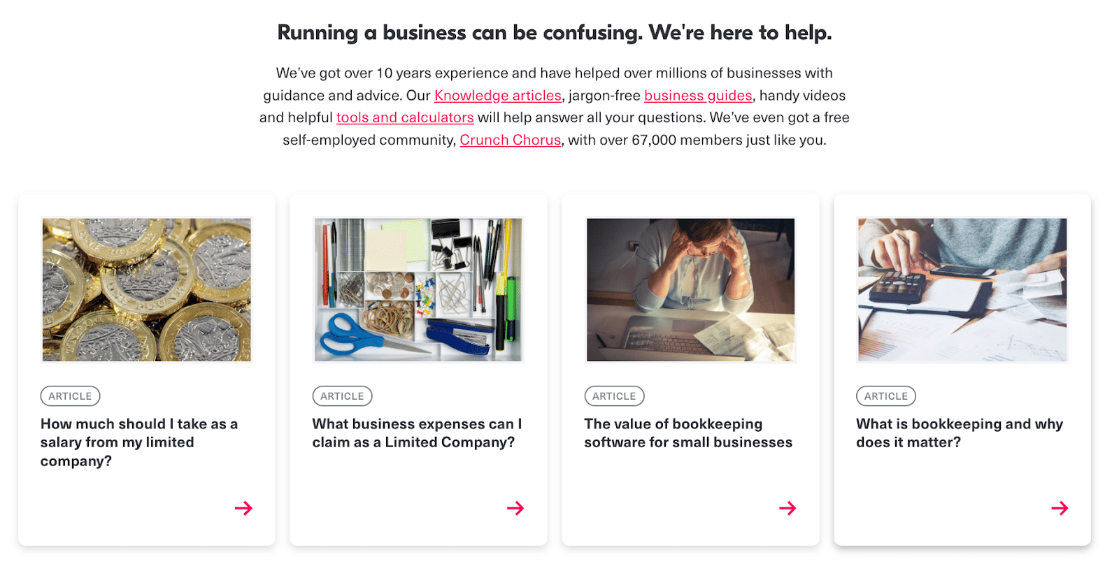 What we’re seeing on Crunch’s homepage is the story of the founder and a recognition of what the business is actually about: solving money problems, not just accounting problems. Then they also have social proof and articles about how you can solve problems. The website also talks about having a self-employed community called Crunch Chorus, which has “over 67,000 members just like you.”