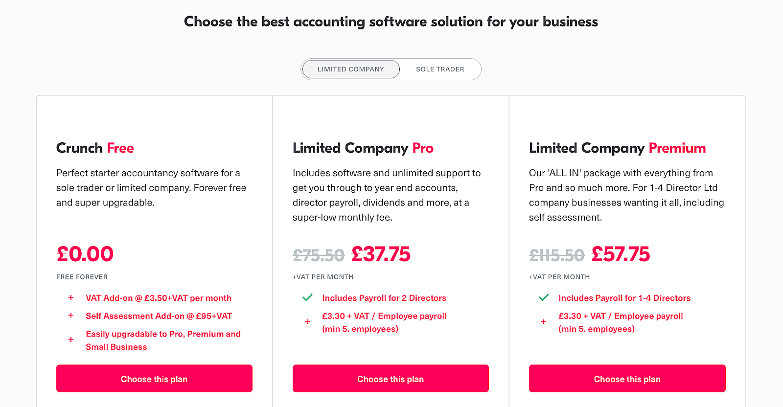 Then, they have the pricing. There’s Crunch Free, which they describe as the “perfect accountancy software for a sole trader or a limited company.” It’s free forever. Then, you have the Limited Company Pro for £37.75 and the Premium for £57.75.