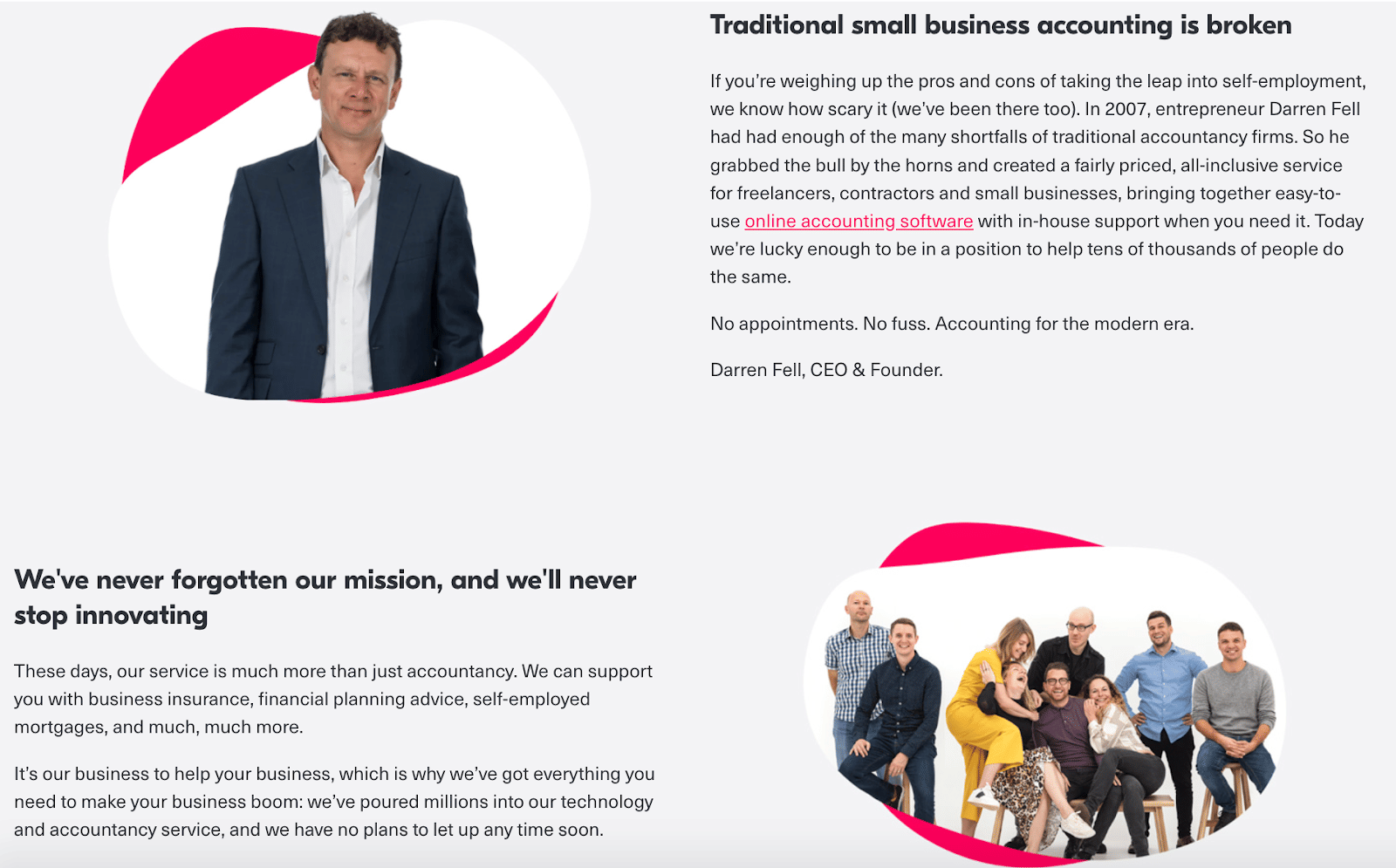 On their website, it says: “...entrepreneur Darren Fell had had enough of the many shortfalls of traditional accountancy firms. So he grabbed the bull by the horns and created a fairly priced, all-inclusive service for freelancers, contractors and small businesses, bringing together easy-to-use online accounting software with in-house support when you need it. Today we’re lucky enough to be in a position to help tens of thousands of people do the same. No appointments. No fuss. Accounting for the modern era.”